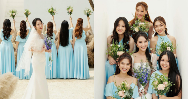 Trong loạt ảnh, Primmy mặc váy cưới trắng thướt tha còn các chị em bạn dì diện váy màu xanh da trời - màu sắc yêu thích của cô dâu. Ai cũng trang điểm nhẹ nhàng, cầm một bó hoa cực kì xinh xắn và đều toát lên gương mặt thanh tú.