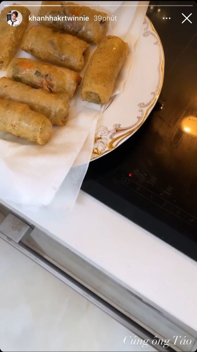 Gia đình nhà Cam đã chia sẻ hình ảnh mâm cơm ngày 23 Tết. Các món được vợ chồng Kiên Hoàng chuẩn bị trong ngày đưa ông Táo về trời khá thịnh soạn đúng kiểu mâm cỗ miền Bắc, tiêu biểu như: chả giò, gà luộc, bánh chưng,...