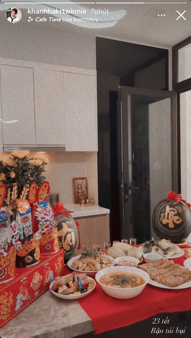 Khánh Hà - tiểu thư từng hẹn hò với thiếu gia Phan Hoàng cũng chuẩn bị một mâm cơm tươm tất để cúng ông Công ông Táo. "23 Tết, bận túi bụi", caption chứng tỏ cô nàng là đầu bếp chính của hôm nay?