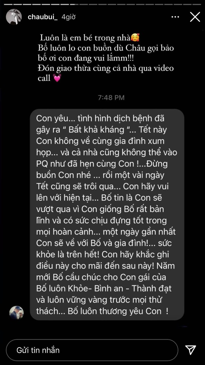 Châu Bùi đón Tết xa nhà vì tình hình dịch bệnh. Trước thềm giao thừa, cô nàng cũng khoe tin nhắn dặn dò của bố.