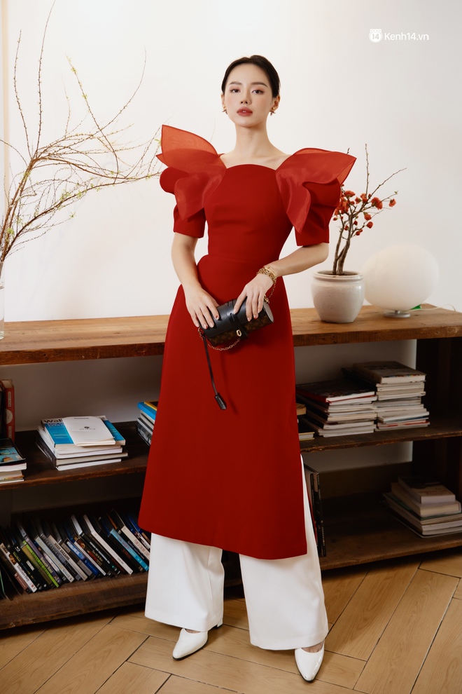Để nói về set đồ đầu tiên cho ngày đầu năm, Linh nghĩ áo dài sẽ là trang phục vô cùng thích hợp để chị em khoe dáng. Thế nên Linh cố tình chọn một chiếc áo dài nhung đỏ với chi tiết cánh bướm ấn tượng hai bên vai, cũng nhờ vậy nên tỉ lệ vai - eo hoàn hảo hơn một chút. Linh thích bộ cánh này vì khi diện lên sẽ giúp mình đằm thắm nhưng vẫn trẻ trung. Tất nhiên, không thể thiếu những món phụ kiện quan trọng đi kèm. Và với bộ áo dài đỏ rực rỡ, Linh chọn kết hợp với giày mũi nhọn màu trắng, túi LV hoạ tiết monogram và đôi khuyên tai cánh hoa màu vàng sang trọng.