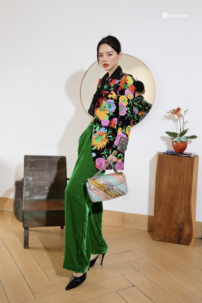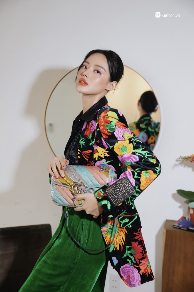 Bộ cánh thứ 3 cũng là trang phục cá tính, nổi bật nhất trong cả 5 vì Linh nghĩ mùng 3 sẽ là dịp để các bạn đi chơi, gặp gỡ bạn bè và cần lên đồ ấn tượng. Vì vậy, Linh gợi ý một set đồ màu sắc hơn nhưng cũng vẫn hết sức thanh lịch đấy. Đồ của Gucci sẽ là lựa chọn ăn mặc hay ho cho những cô nàng thích "chơi" màu sắc, bởi blazer nhung hoạ tiết hoa xanh/đỏ và quần nhung the màu xanh vốn là item khó nuốt nhưng lại hài hoà khi được mix chung. Bên cạnh đó, điểm nhấn của set đồ còn có chiếc túi lấp lánh sặc sỡ nữa.