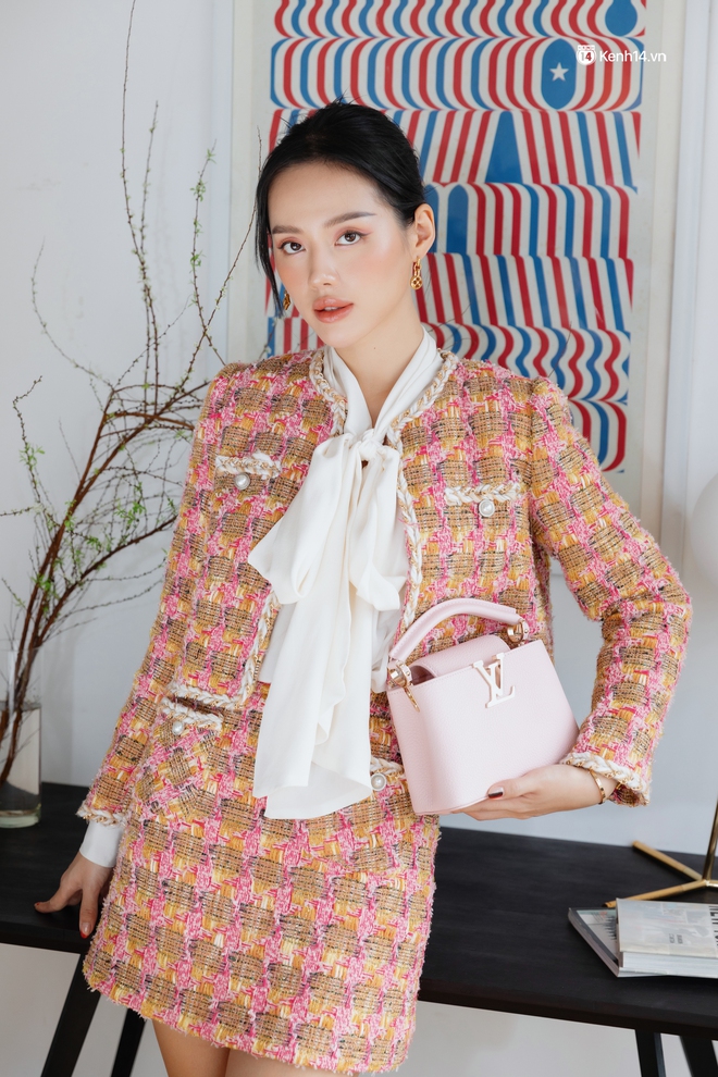 Set đồ thứ 2 gần với phong cách ngày thường của Linh chính là một set váy áo tweed matchy có gam màu nhẹ nhàng, tươi sáng. Đây cũng là set đồ phù hợp để diện trong những ngày Tết ở Hà Nội khi trời không quá lạnh. Chất liệu tweed mặc sang, đồng thời phù hợp với nhiều độ tuổi. Tuy nhiên, với một cô gái năng động như Linh thì Linh chọn cách mix bộ tweed hồng vàng lấp lánh với boots cao đến gối màu vàng be để tổng thể thêm phần cá tính và cũng giúp chân thêm dài. Để hoàn thiện outfit, Linh mix thêm khuyên tai và túi xách LV cho tông xuyệt tông với set đồ đang diện.