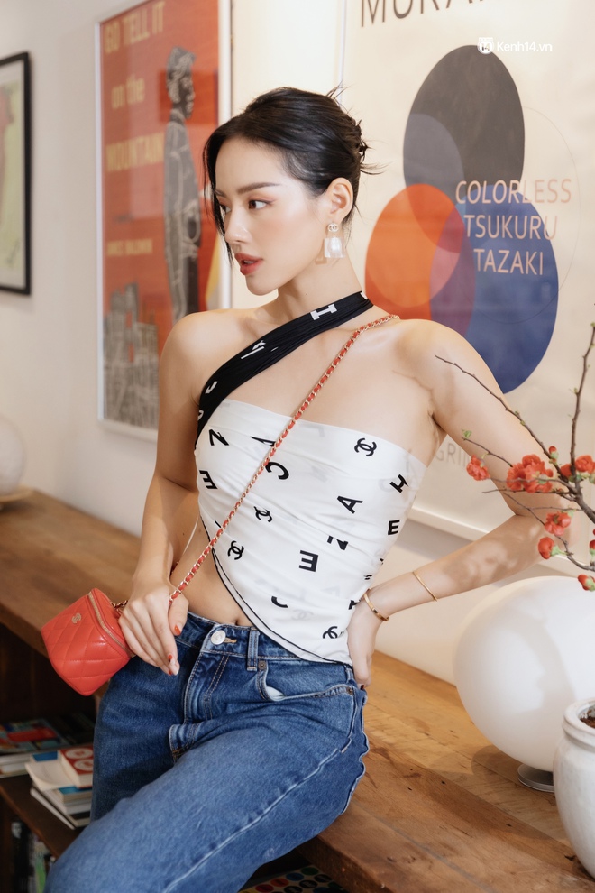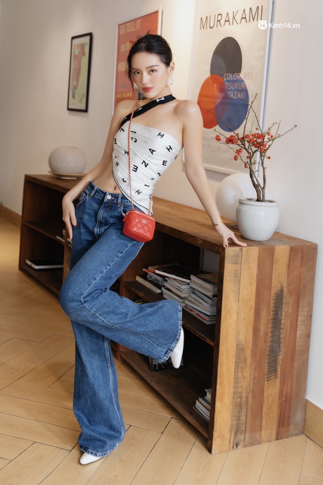 Với trang phục cho ngày mùng 4 Tết, Linh cố tình gấp khăn thành áo để tạo nên vẻ ngoài mới lạ, trendy, đồng thời cũng biến outfit thời thượng, cool hơn rất nhiều. Và Linh cũng chọn kết hợp khăn áo với quần jeans ống rộng cạp cao để thêm tôn dáng. Đi cùng với set đồ là đôi giày cao gót 10cm và túi đeo chéo có dáng hộp vuông của Chanel. Linh cũng chọn chiếc túi có màu sắc nổi bật để bộ cánh trông thú vị hơn.