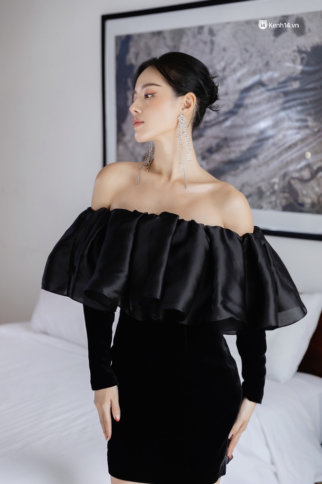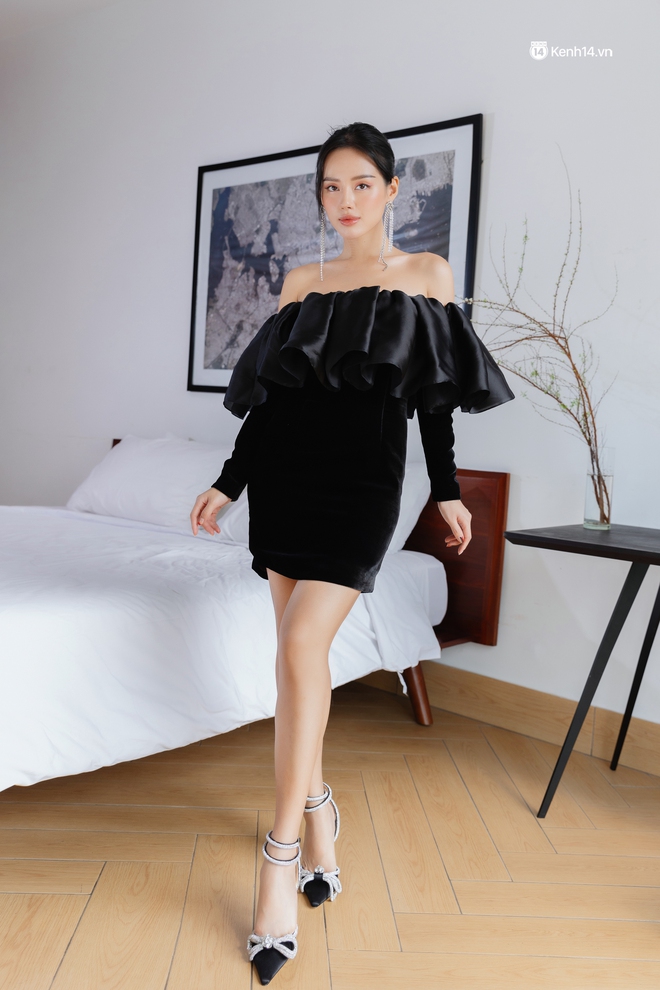 Outfit cuối cùng Linh lựa chọn sẽ là một chiếc váy đen little black dress, đơn giản nhưng cực kì sang trọng, sẽ rất hợp để bạn diện trong một bữa tiệc đầu năm. Item Linh chưng diện vốn có thiết kế trễ vai với phần bèo nhún mềm mại, tạo cho các cô gái nét gợi cảm, nữ tính. Nhưng để diện mạo trở nên thu hút, bắt mắt hơn, Linh cố tình chọn khuyên tai lấp lánh và đôi giày đen với chi tiết nơ đính đá vừa duyên dáng, vừa hợp với trang phục.