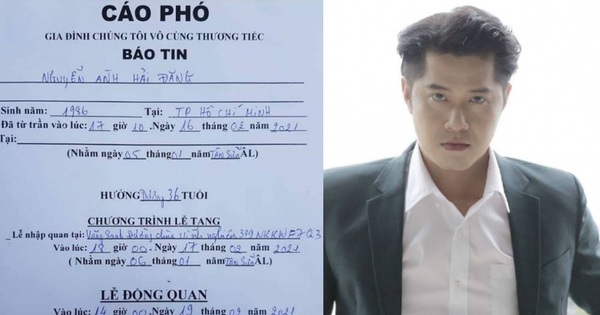 Cho đến chiều ngày 17/2, cáo phó chính thức về lễ tang của cố diễn viên Hải Đăng đã được chia sẻ. Lễ nhập quan sẽ được cử hành tại nhà tang lễ Vãng Sanh Đường chùa Vĩnh Nghiêm, số 339 Nam Kỳ Khởi Nghĩa, phường 7, quận 3, TP.HCM vào 18h hôm nay (17/2). Bên cạnh đó, linh cữu của cố nghệ sĩ sẽ được đưa đi hoả táng vào 14h ngày 19/2 tại Trung tâm Hoả táng Bình Hưng Hoà, TP.HCM.