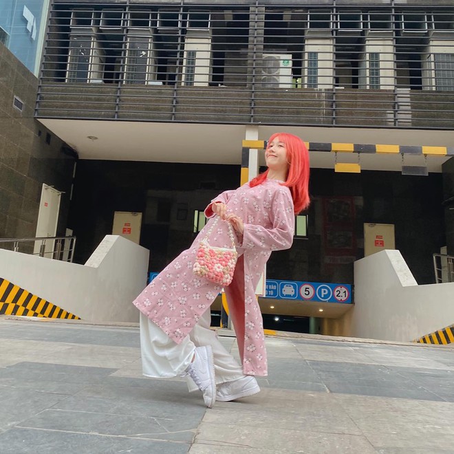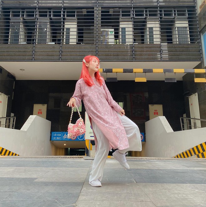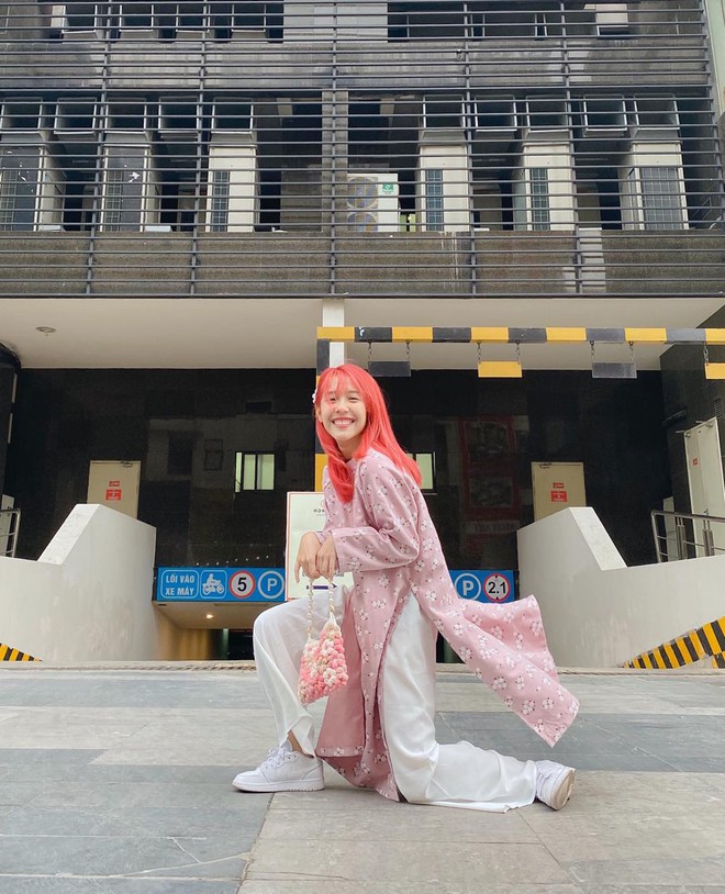 Hậu Hoàng diện áo dài, cầm túi xách hồng cực xinh