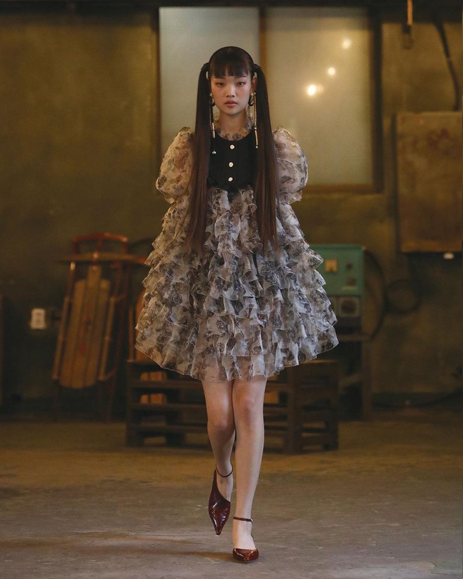 Ninh Dương Lan Ngọc lại đụng với Park Min Young ở đôi giày đính nơ thú vị. Cô mix giày cùng sườn xám cách tân. Tuy nhiên tông đỏ rực của váy tạo cảm giác cô như bao lì xì.