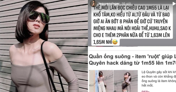 Theo đó, sau khi nhận được bài viết có nội dung cô chỉ cao 1m55, Lệ Quyên liền chụp lại màn hình và phản bác: "Thề, mỗi lần đọc chiều cao 1,55m là lại khổ tâm. Không hiểu từ ai, từ đâu và từ bao giờ ai ăn bớt 8 phân, để giờ cứ truyền miệng nhau mà nói hoài thế. Sao không cho em thêm 2 phân để từ 1,63m lên 1,65m nhỉ".