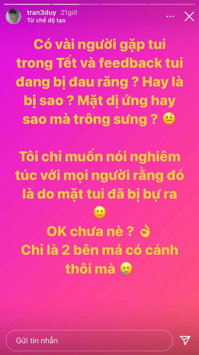 Éo le nhất phải kể đến cựu hot boy Trần Ba Duy - bố Đậu. Cực chẳng đã, Ba Duy đã phải lên mạng thú nhận rằng mặt mình bị bự ra chứ không phải đau răng hay sưng do dị ứng như mọi người tưởng.