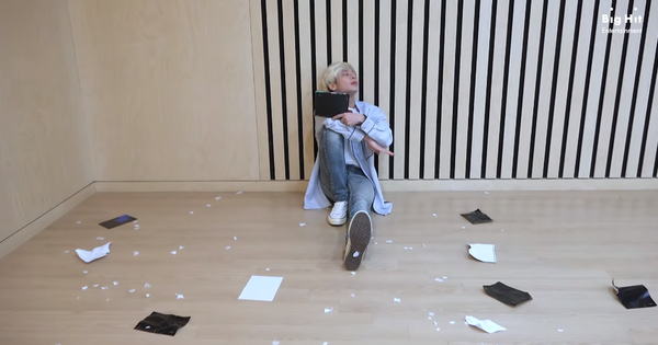Taehyun vừa cầm album vừa nhảy, dưới sàn là những trang giấy bị xé nát