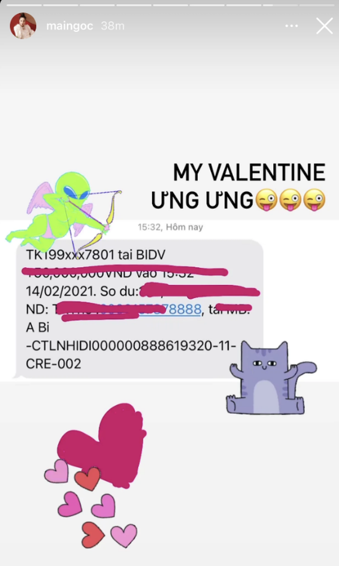 Lễ Tình nhân năm nay rơi vào mùng 3 Tết nên muốn ngoài đọ lì xì thì người ta còn đọ quà Valentine. Mai Ngọc khoe được chồng chuyển một khoản tiền lên đến 9 chữ số. Thiếu gia Hà thành mà, quà Valentine nó phải "khác bọt" chứ!