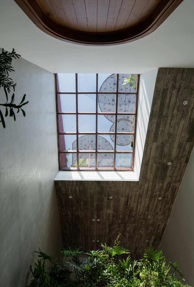 Và cuối cùng là khoảng sân giặt phơi, lối lên sân vườn, toàn bộ diện tích mái dốc được sử dụng để trồng cây che mát, hoa và rau sạch. Khoảng vườn xanh giữa phố thị này là điểm nhấn cho ngôi nhà, đồng thời tạo ra một không gian trong lành, nơi các thành viên có thể sinh hoạt và thư giãn, ngắm nhìn thành phố mỗi ngày.