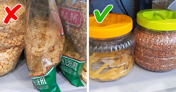 Túi ngũ cốc, túi mì ống và các loại thực phẩm khô khác chất đống lên là chúng ta sẽ có một cảnh chẳng đẹp mắt chút nào. Tốt nhất là bạn nên bảo quản thực phẩm khô trong các hộp đựng đặc biệt. Chúng rất tiện lợi và thức ăn sẽ được bảo quản tốt hơn trong những chiếc lọ này.