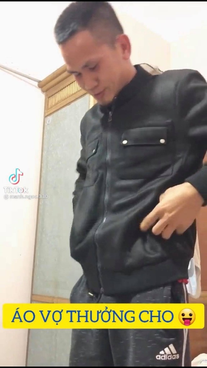 Clip: Nguyễn Ngọc Mạnh đang thử áo vợ tặng (Nguồn: TikTok)