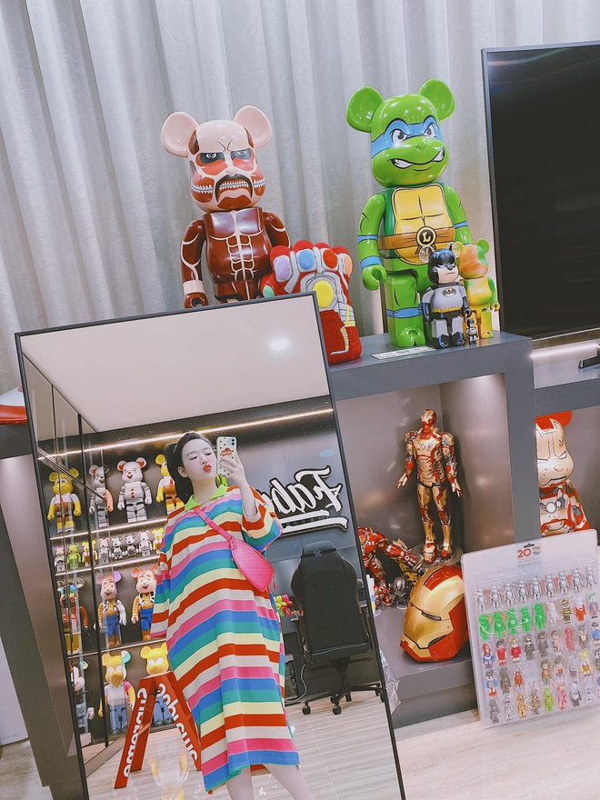 Địa điểm hoành tráng và gây ấn tượng nhất trong ngôi nhà phải kể đến phòng lớn nơi trưng bày bộ sưu tập túi hiệu của Vân Tiny, bộ sưu tập Bearbrick - thú vui đắt đỏ dành cho giới siêu giàu của Fabo Nguyễn cũng như giày dép chung của hai vợ chồng. Để mà đếm được số lượng túi tắm, giày dép hay mô hình đồ chơi ở đây thì chắc cũng mất cả buổi đấy!