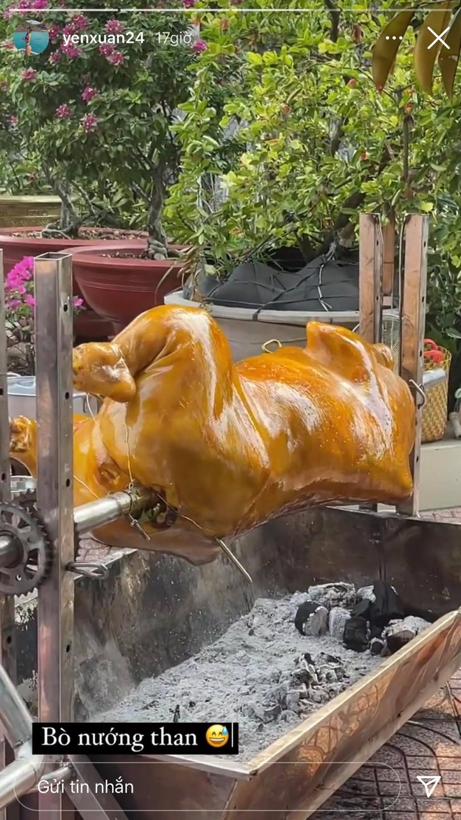 Điều đáng nói là trong lần về Việt Nam này, cặp đôi đã vui vẻ để lộ chuyện về nhà gái ở Củ Chi (Tp.HCM). Cụ thể, Yến Xuân khoe đang ở nhà và gia đình đã mổ một chú bò nướng than to đùng vật vã từ hôm qua (27/3). Trong khi đó phải đến hôm nay (28/3), chàng thủ môn quốc dân mới đăng story đứng quay bò nướng.