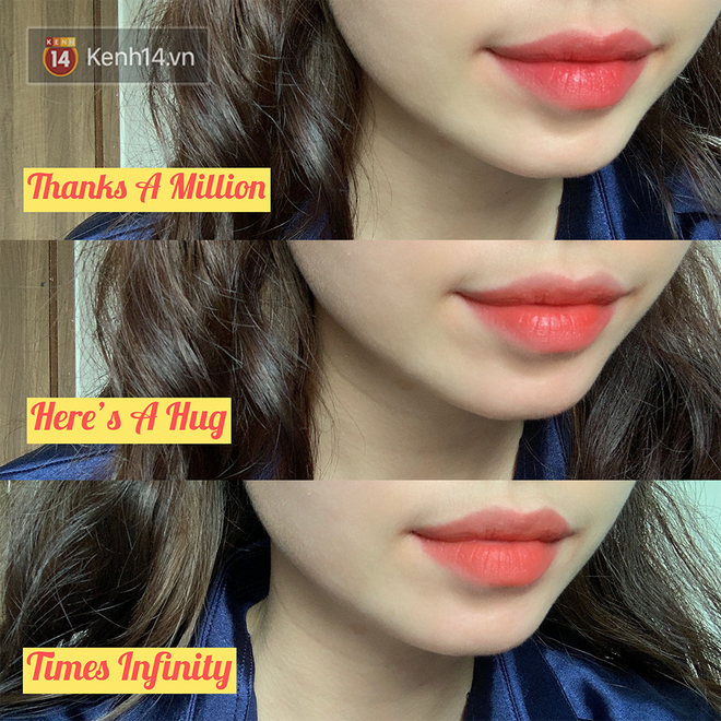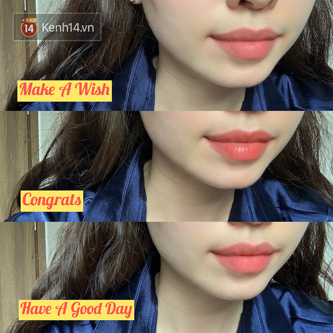 Ban đầu khi nhìn màu son trên thỏi thì mình cũng hơi hốt hoảng vì sợ khó đánh nhưng khi lên môi thì khác hẳn. Màu khá dễ dùng, kể cả những màu nhạt như Make A Wish hay Have A Good Day cũng không hề tạo cảm giác tái nhợt dù mình không makeup mấy. Tất nhiên nếu muốn xinh hơn thì bạn vẫn nên makeup mắt một chút.