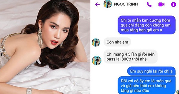 Và rất nhanh, Ngọc Trinh đã có phản hồi về giá chiếc nhẫn: "Còn nha em. Chị mang bốn, năm lần rồi nên bán lại 800 triệu thôi nhé". Nhận ra đây là một con số "trên trời", vượt quá khả năng tài chính của mình thì fanboy này đã nhanh chóng... "quay xe": "Em suy nghĩ lại rồi chị ạ. Đối với cô ấy em là món quà vô giá nên em không tặng gì nữa đâu".