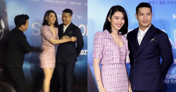 Đáng chú ý, cùng chụp ảnh trên thảm đỏ của event chính là nữ diễn viên trẻ Thúy Ngân cùng Trương Thế Vinh - cặp đôi đang được netizen "đẩy thuyền" nhiều nhất ở thời điểm hiện tại. Sau màn chụp ảnh chung với dàn sao, mọi người đang rời đi thì Trường Giang lại nổi máu "tinh nghịch", chỉ 1 cú đẩy nhẹ đã khiến Thúy Ngân ngã vào lòng Trương Thế Vinh quá sức nhẹ nhàng. Nam tài tử thì chỉ biết làm "bức tường" đỡ cho nữ diễn viên trẻ, nở nụ cười tế nhị nhưng không biết trong lòng đang cảm thấy ra sao?
