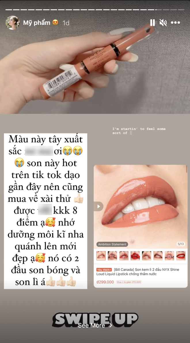 Hai thỏi son cuối cùng cô nàng chia sẻ là siêu phẩm hot trên TikTok dạo gần đây: son hai đầu NYX Shine Loud High Shine Lip Color nhé! Thế nên cô nàng quyết tậu về hẳn 2 màu son là Ambition Statement và Never Basic. Trong đó, Ambition Statement là tông nâu tây xuất sắc đạt 8/10 điểm. Hot girl cho hay để đánh son đẹp thì chị em cần dưỡng môi kĩ trước, son có 2 đầu son bóng và son lì nên hợp với nhu cầu makeup của nhiều nàng đó nha!