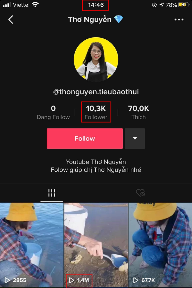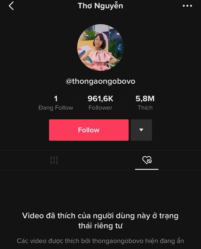 Thậm chí một tài khoản có tên @thonguyen.tieubaothui, mới được lập ra từ ngày 15/3 nhưng đã sở hữu clip 2 triệu view (tính đến 17h30 ngày 16/3), lọt vào phần suggest trên TikTok. Như một lẽ đương nhiên, netizen đổ xô về tài khoản "pha ke" này, follow có, để lại bình luận khiếm nhã cũng có nốt. Cụ thể chỉ trong khoảng 1 tiếng đồng hồ (từ 13h40 - 14h46 ngày 16/3), lượng followers trên tài khoản này đã tăng lên gần 2k lượt, lượng thả tim tăng hơn 15k.