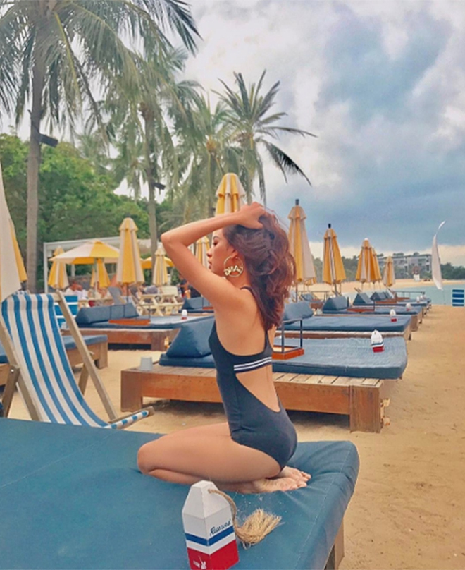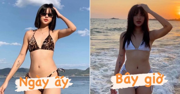 Ảnh bikini của Tú Hảo hồi 2019 (trái) và hiện tại (phải)