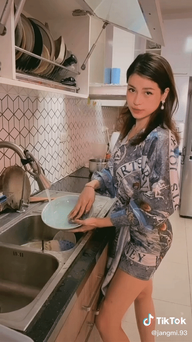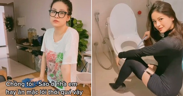 Cô nàng đã lần lượt mặc váy body đen quyến rũ... cọ toilet, mặc đầm xẻ đùi lau nhà, mặc outfit lụa rửa bát, mặc váy ren đi đổ rác, mặc váy 2 dây giặt quần áo... Nói chung là xinh và xịn! Không rõ anh chồng phản ứng sao chứ dân mạng xem qua màn hình mà cũng thấy "đổ mồ hôi hột" thay, đồng thời cũng khá lo lắng cho số phận anh nhà.