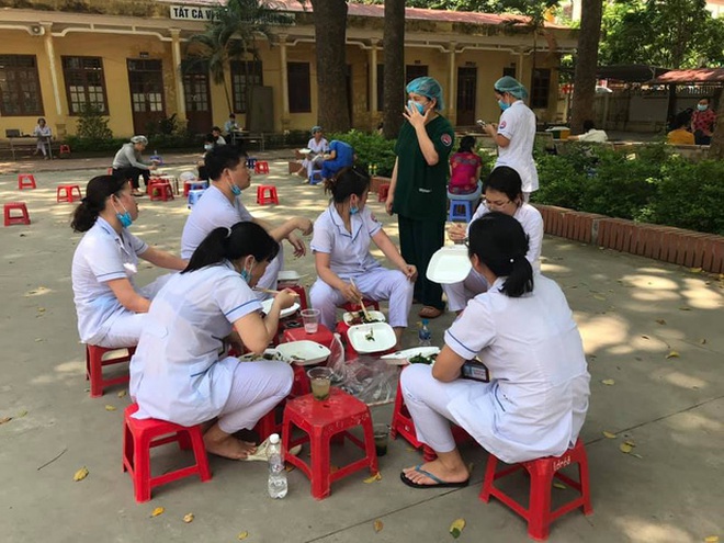 Những bữa cơm vội, những phút chợp mắt ở góc phòng hay ngoài hành lang... là hình ảnh dễ dàng bắt gặp của các "chiến sĩ" nơi tuyến đầu chống dịch. Thậm chí, nhiều y bác sĩ, nhân viên y tế kiệt sức, ngã quỵ giữa trưa hè nắng nóng khi lấy mẫu xét nghiệm. Hình ảnh tấm lưng phồng rộp ửng đỏ, đôi bàn tay nhăn nheo, gương mặt phờ phạc in hình dây đeo khẩu trang,… sau lớp áo bảo hộ kín mít khiến ai cũng xúc động, cảm phục.