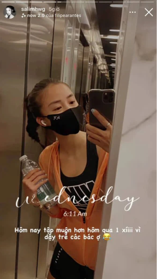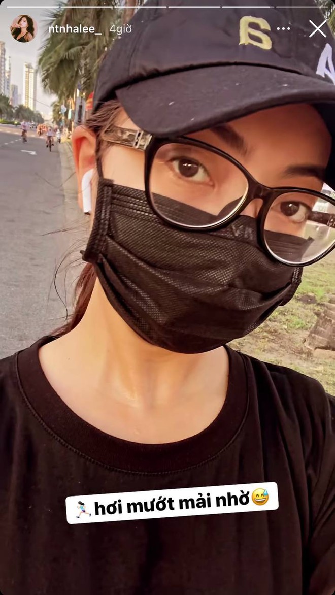 Nhật Lê cũng dậy sớm chạy bộ. Không biết cô nàng đã chạy được bao nhiêu km mà mướt mồ hôi luôn rồi nè!