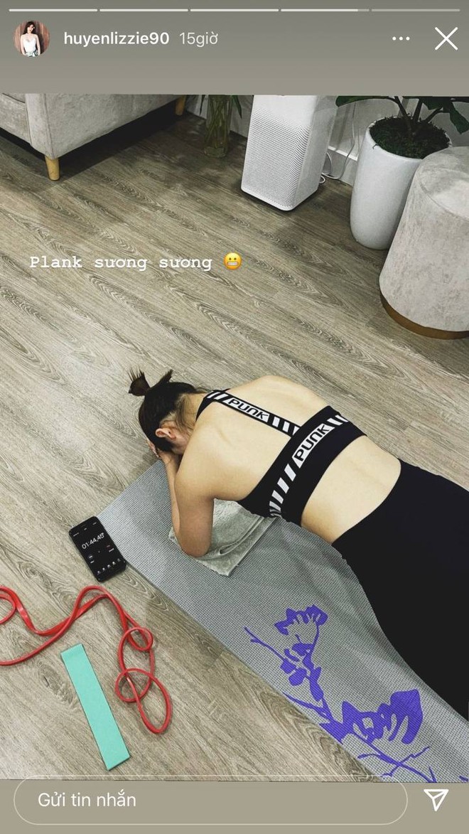 Hot girl đời đầu Huyền Lizzie cũng tập tành "plank sương sương" tại gia để giữ dáng. Dù đã bước qua tuổi 30, gái xinh vẫn được khen ngợi bởi sắc vóc trẻ trung của mình.