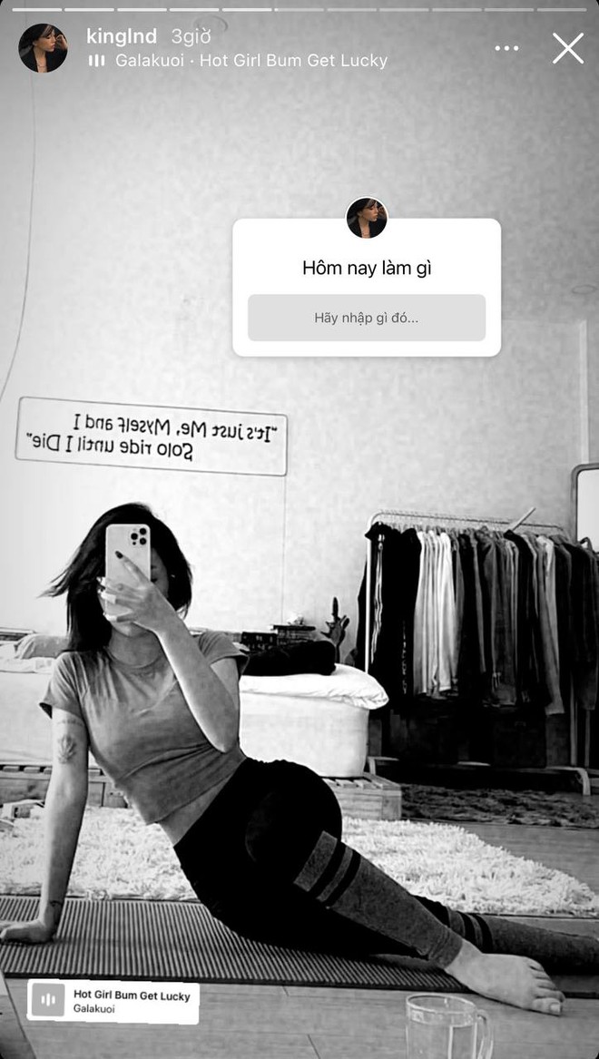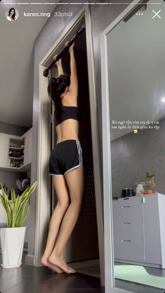 Gái xinh Karen Nguyễn cũng tham gia tập tành giữ dáng mùa dịch. Cô nàng chăm chỉ hít xà, tập các bài tập đơn giản tại nhà.