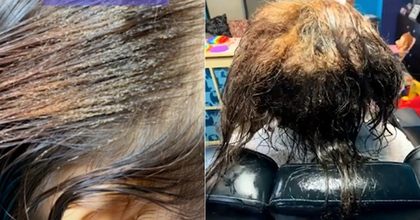 Mái tóc của vị khách hàng hoàn toàn xơ xác vì trước đó dùng hoá chất trị chấy