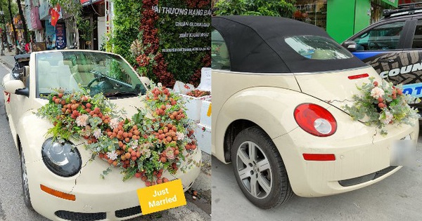 Theo hình ảnh được chia sẻ, chiếc xe mui trần màu trắng sang trọng được trang trí rất cầu kì bởi hoa, lá và vải thiều. Sự sáng tạo in đậm dấu ấn đặc sản quê nhà này được dân tình thích thú, không tiếc lời khen ngợi.