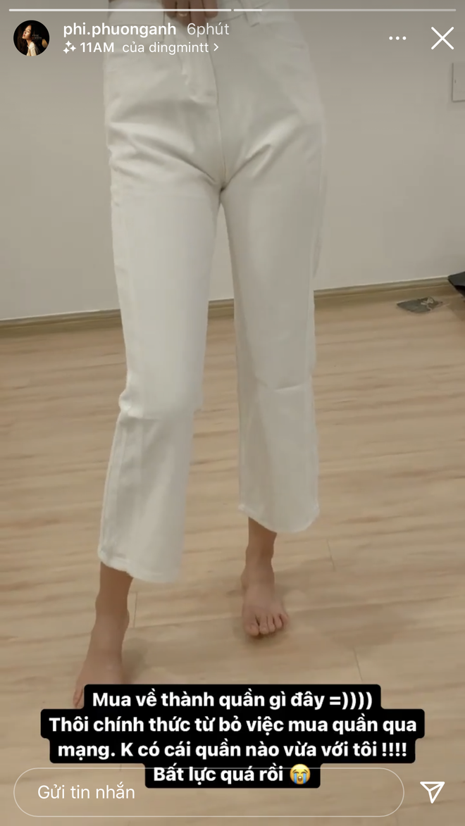 Chuyện là gái đẹp lên mạng order một chiếc quần ống rộng màu trắng khá xinh xắn. Trong ảnh minh hoạ, người mẫu mặc cực kì rộng rãi, thoải mái. Nhưng minh hoạ vốn chỉ để minh hoạ, khi chiếc quân về đến tay Phí Phương Anh thì lại ngắn cũn cỡn, cao trên mắt cá chân cả khúc.