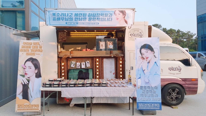 Hóa ra, đây chính là quà của DC Gallery Song Hye Kyo - cộng đồng người hâm mộ đông đảo nhất Hàn Quốc của nữ diễn viên. Cộng đồng này luôn đồng hành bên Song Hye Kyo bất chấp bao scandal hay tin đồn, luôn ủng hộ nữ diễn viên trong suốt sự nghiệp diễn xuất. Song Hye Kyo Baidu Bar - cộng đồng fan của nữ diễn viên tại Trung Quốc cũng gửi xe đồ ăn đến phim trường trong ngày hôm nay.