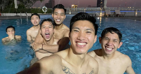 Các cầu thủ lúc này đã bỏ xuống những áp lực, chỉ đơn giản là vui đùa bên nhau trong bể bơi. Ai cũng cười tươi, thi nhau tạo dáng để chụp ảnh kỉ niệm với đủ các tư thế như giơ nắm đấm, xòe 2 tay, thả tim hay làm mặt xấu... Niềm vui sau khi giành chiến thắng trong trận đấu gặp Malaysia đêm qua càng khiến nụ cười của hội tuyển thủ thêm rạng rỡ.
