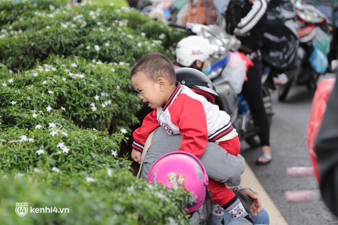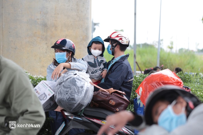 Trong sáng nay, nhiều người cũng mang theo con nhỏ, những đứa trẻ tầm 2 - 4 tuổi hồn nhiên theo cha mẹ trên xe máy về quê cũng tỏ ra mệt mỏi vì phải chờ đợi cả buổi sáng mà không ra được khỏi Thành phố