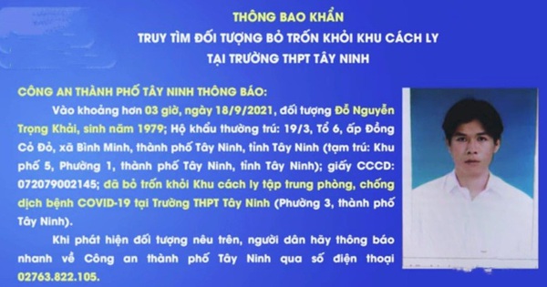 Theo Công an TP Tây Ninh, khoảng hơn 3h ngày 18/9, đối tượng Đỗ Nguyễn Trọng Khải (SN 1979, tạm trú tại Khu phố 5, Phường 1, TP Tây Ninh) đã bỏ trốn khỏi Khu cách ly tập trung phòng, chống dịch bệnh COVID-19 tại Trường THPT Tây Ninh (Phường 3, TP Tây Ninh).
