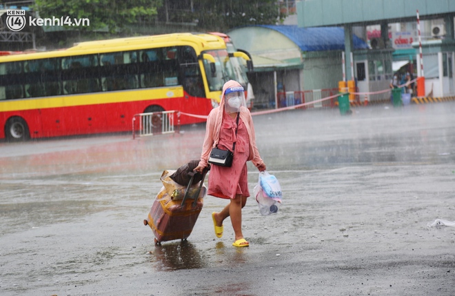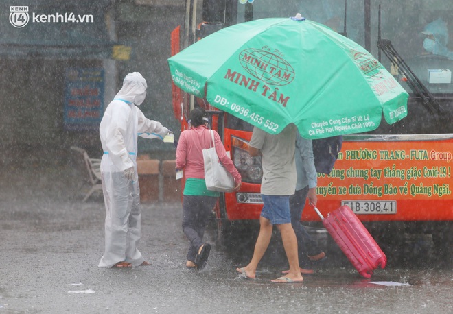 Vì trời bất chợt đổ cơn mưa lớn khiến các thai phụ trở tay không kịp, đứng dầm mưa ngay tại BX miền Đông. Đứng nép mình một góc, chị Hằng (SN 1998), ngụ tại xã Hành Tính Tây, huyện Nghĩa Hành co ro vì cơn mưa lớn.