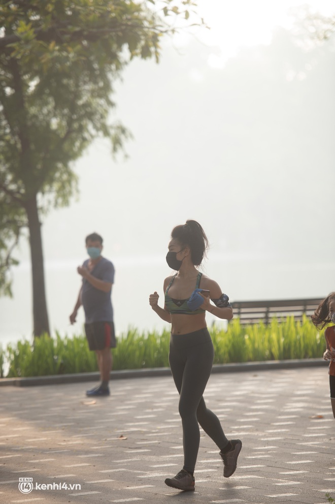 Một hình ảnh rất khó có thể tưởng tượng nổi vào nhiều năm trước thì giờ đây lại vô cùng phổ biến, đó là tập thể dục với chiếc khẩu trang. Không khó để thấy rằng dù đang tập tành miệt mài, mồ hôi nhễ nhại nhưng người dân đều đeo khẩu trang rất cẩn thận, có người còn đeo cảm tấm chống giọt bắn. Có thể thấy, dù đã được nới lỏng hơn nhưng tinh thần chống dịch của nhiều người dân vẫn rất cao.